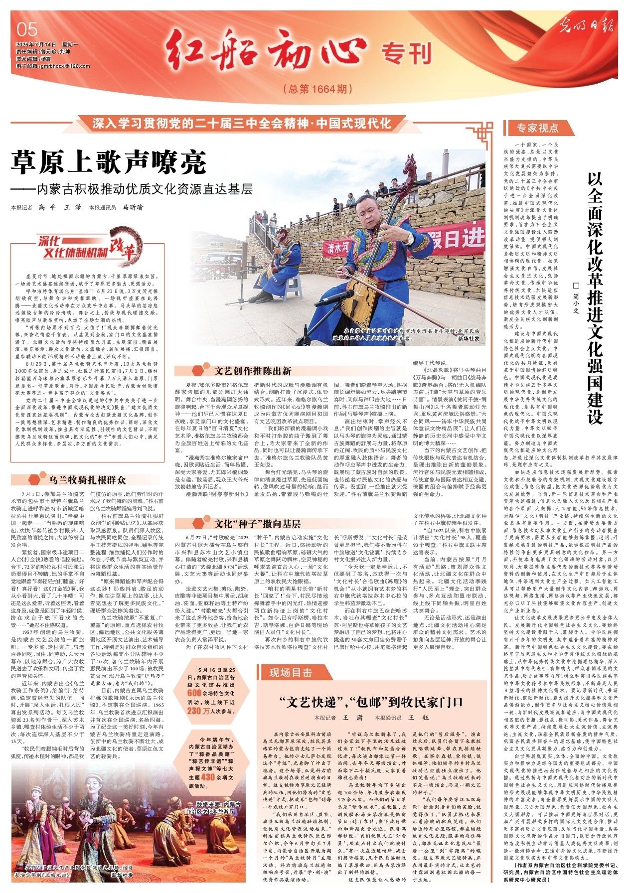 2025年7月14日,《光明日報》第5版刊發(fā)題為《草原上歌聲嘹亮——內(nèi)蒙古積極推動優(yōu)質(zhì)文化資源直達(dá)基層》的文章,報道了盛夏時節(jié),地處祖國北疆的內(nèi)蒙古,千里草原綠浪如茵。一場場藝術(shù)盛宴連續(xù)登場,賦予了草原更多魅力、更強活力。