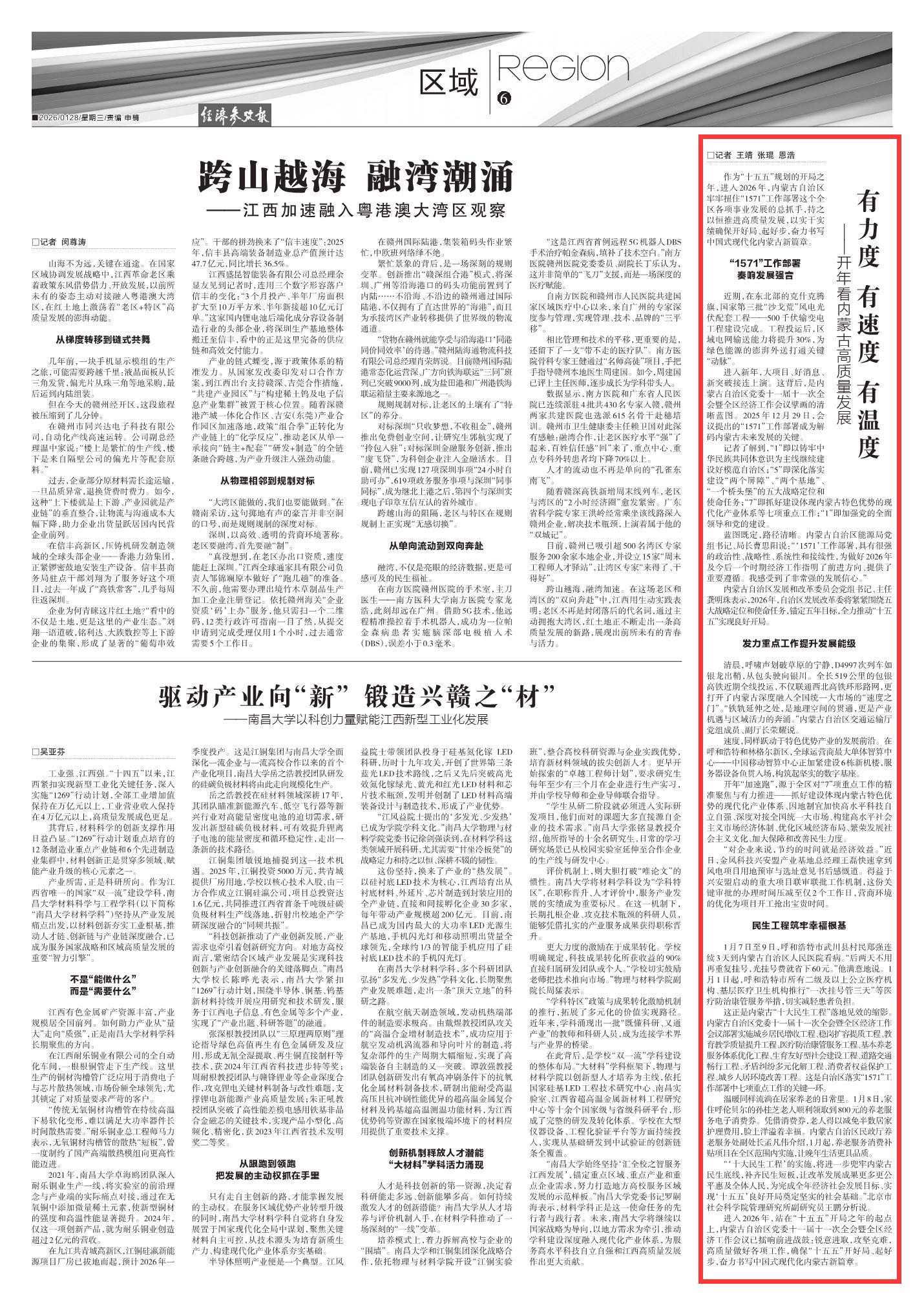 2026年1月28日《經(jīng)濟(jì)參考報(bào)》第6版刊發(fā)了《有力度 有速度 有溫度——開年看內(nèi)蒙古高質(zhì)量發(fā)展》的文章,報(bào)道了進(jìn)入2026年,站在“十五五”開局之年的起點(diǎn)上,內(nèi)蒙古自治區(qū)黨委十一屆十一次全會(huì)暨全區(qū)經(jīng)濟(jì)工作會(huì)議已擂響前進(jìn)戰(zhàn)鼓:銳意進(jìn)取,攻堅(jiān)克難,高質(zhì)量做好各項(xiàng)工作,確?!笆逦濉遍_好局、起好步,奮力書寫中國(guó)式現(xiàn)代化內(nèi)蒙古新篇章。