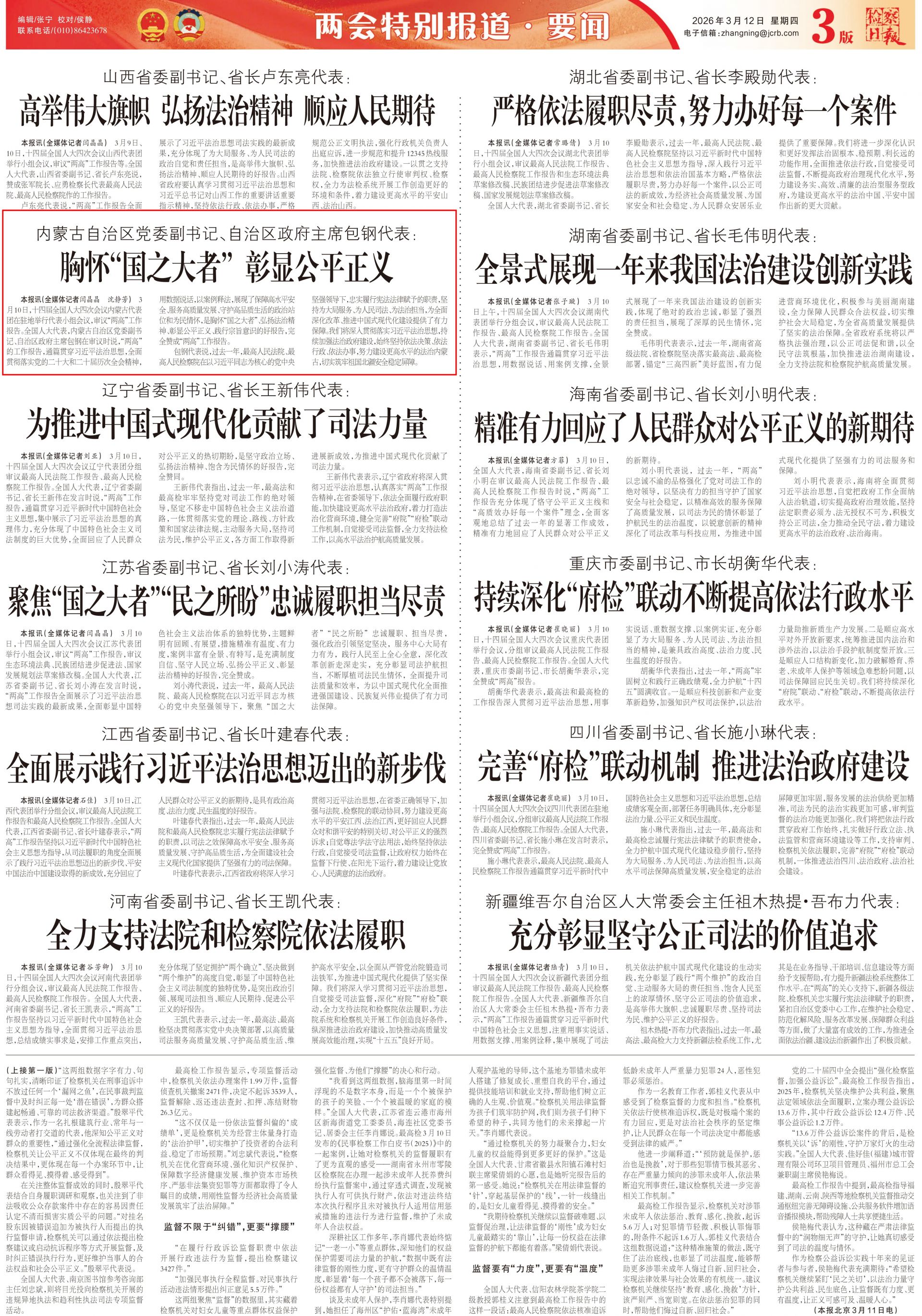 2026年3月11日《檢察日報》第3版刊發(fā)了《內(nèi)蒙古自治區(qū)黨委副書記、自治區(qū)政府主席包鋼代表: 胸懷“國之大者” 彰顯公平正義 》的文章,報道了十四屆全國人大四次會議內(nèi)蒙古代表團在駐地舉行代表小組會議,審議“兩高”工作報告。全國人大代表,內(nèi)蒙古自治區(qū)黨委副書記、自治區(qū)政府主席包鋼在審議時說,“兩高”的工作報告,通篇貫穿習(xí)近平法治思想,全面貫徹落實黨的二十大和二十屆歷次全會精神,用數(shù)據(jù)說話,以案例釋法,展現(xiàn)了保障高水平安全、服務(wù)高質(zhì)量發(fā)展、守護高品質(zhì)生活的政治站位和為民情懷,是胸懷“國之大者”、弘揚法治精神、彰顯公平正義、踐行宗旨意識的好報告,完全贊成“兩高”工作報告。