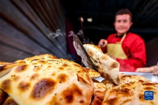 2月26日,在托克扎克鎮(zhèn)農(nóng)貿(mào)市場,名為“庫麥其”的當?shù)貍鹘y(tǒng)面食剛剛出爐。