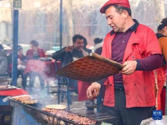 2月26日,在托克扎克鎮(zhèn)農(nóng)貿(mào)市場的一處燒烤攤,攤主在烤制肉串。