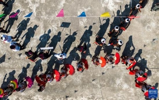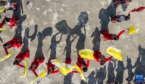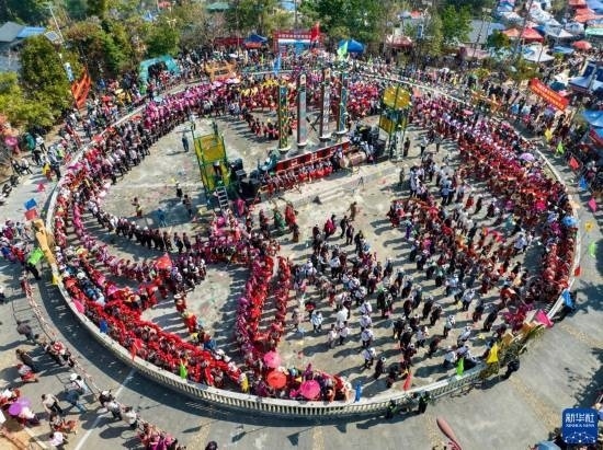 3月2日,當(dāng)?shù)厝罕娕c來(lái)自各地的游客踩著相同的鼓點(diǎn)進(jìn)場(chǎng)舞蹈(無(wú)人機(jī)照片)。
