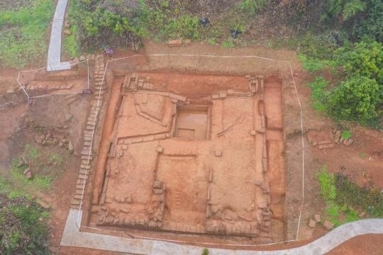 這是2月9日在重慶合川釣魚城遺址拍攝的新發(fā)掘出的類似闕臺建筑的基址(無人機照片)。新華社記者 黃偉 攝