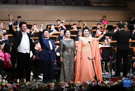5月25日,在天津大劇院音樂廳,歌唱家王澤南(左一)、王宏偉(左二)、關(guān)牧村(左三)、張晏蓉等在舞臺上演出。