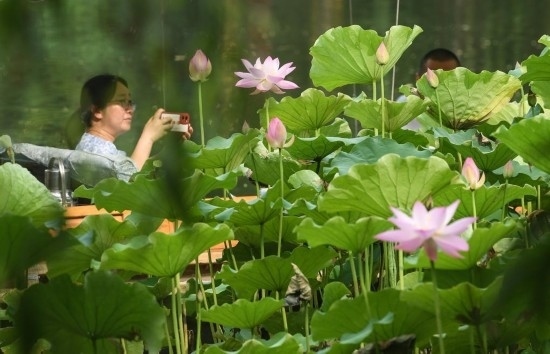 6月11日,游客在曲院風(fēng)荷景區(qū)欣賞荷花。