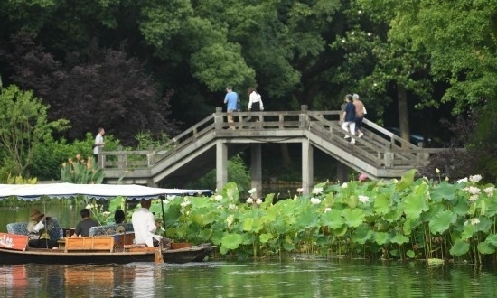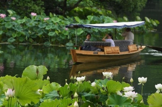 6月11日,游客在曲院風(fēng)荷景區(qū)乘船欣賞荷花。