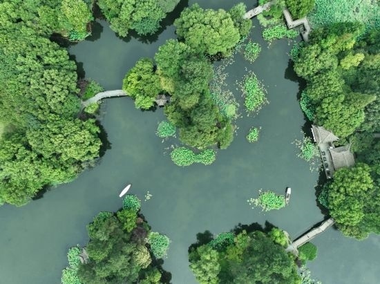 6月11日,游客在曲院風(fēng)荷景區(qū)欣賞荷花(無人機照片)。