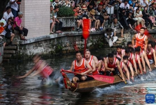 龍船漂移時(shí),船頭船尾的舵手專門負(fù)責(zé)入彎出彎時(shí)的線路和速度控制(6月22日攝)。