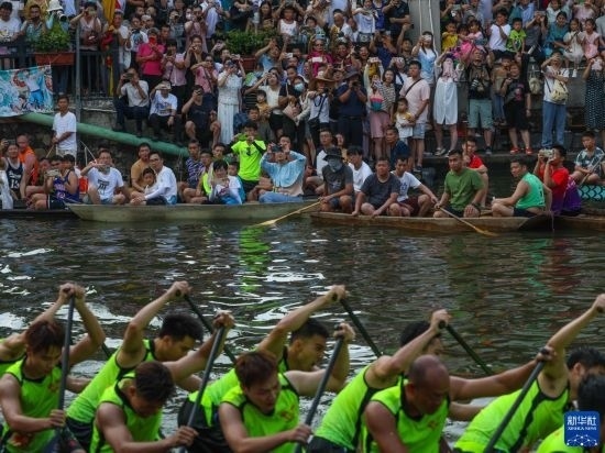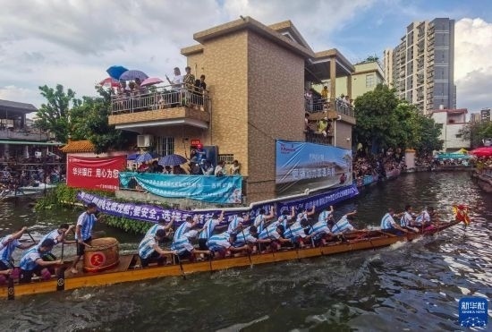 6月22日,佛山疊滘河涌?jī)砂渡踔了系教幨怯^看龍船漂移的觀眾。