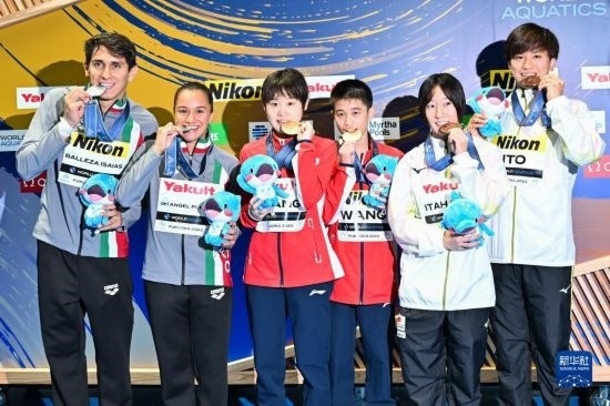 7月15日,冠軍中國組合王飛龍(左三)/張家齊(右三),亞軍墨西哥組合伊薩亞斯(左一)/佩尼切(左二)和季軍日本組合伊藤洸輝(右一)/板橋美波在頒獎儀式上。新華社記者 張笑宇 攝