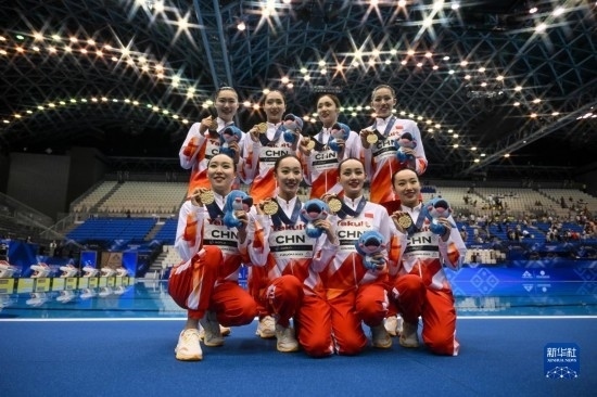 在花游集體自由自選決賽中,預(yù)賽排名第一的中國隊發(fā)揮出最好水平,所有難度動作都得到認(rèn)定,以329.1687分奪冠。日本隊和烏克蘭隊分獲銀牌和銅牌。