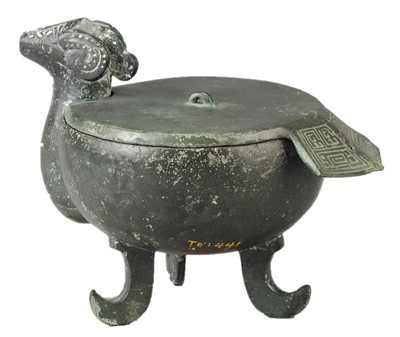 三足羊首銅尊由蓋和器身兩部分組成。蓋呈圓形扁平狀,正中間置一橋型小鈕,邊緣一段半圓弧形豁口卡住羊頸部,另一端向外延伸,略呈扇形并下斜,象征羊尾。腹身一側(cè)外凸成羊頸狀,口沿上部鑄成羊首,頸與尊腹相連。此尊造型生動(dòng)、獨(dú)特,在同類(lèi)器物中實(shí)屬罕見(jiàn),是安徽楚文化博物館7件“鎮(zhèn)館之寶”之一。