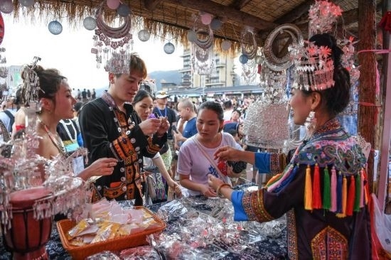 7月1日,游客在貴州“村超”足球賽場旁的文創(chuàng)攤位選購銀飾。新華社記者 楊文斌 攝