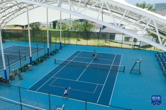 8月9日拍攝的京山文峰網球特色村網球訓練場(無人機照片)。