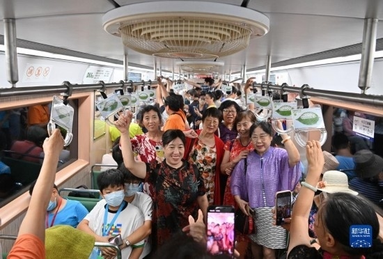 8月14日,乘客在北京地鐵一號線“時光列車”上拍照留念。