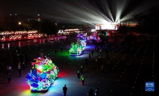唐大明宮是盛唐時(shí)期享有盛名的宮殿群,有著“千宮之宮”的美譽(yù)。國慶期間,古風(fēng)演藝、華服大秀、曲藝匯演、彩車巡游等一系列活動(dòng)在大明宮國家遺址公園持續(xù)上演。夜幕之下,盛唐文化與現(xiàn)代時(shí)尚在此相映生輝,吸引市民游客前來參觀打卡。新華社記者 劉瀟 攝