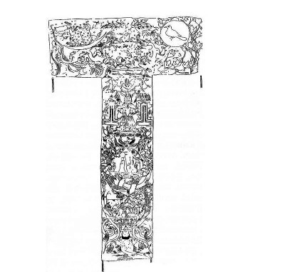 需要指出的是,這一進(jìn)程和墓主人辛追靈魂升仙的進(jìn)程是同步的。馬王堆漢墓T形帛畫的構(gòu)圖和漢代畫像石天界、人間、地下世界的三段模式非常近似,所以很多學(xué)者據(jù)此將T形帛畫也劃分為天界、人間、地下三部分。但這種看法我不贊成。我比較贊同T形帛畫的主題是引魂升天的主張。日本京都大學(xué)教授曾部川寬對漢代靈魂升仙的主題有非常深入的研究。1981年他出版的《向昆侖山升仙——古代中國人描繪的死后世界》(《崑崙山への昇仙——古代中國人が描いた死後の世界》)中,指出這幅非衣的主題就是升仙主題。整幅T形帛畫描述的是墓主人辛追升仙的進(jìn)程。從下到上,T形帛畫中央整個中軸貫穿著的是一個升騰的主題。陰陽兩條龍自下而上在中央部分穿璧而過,托舉起魂車?;贶嚿系暮诵娜宋锿ǔUJ(rèn)為就是墓主人辛追。按照這一解釋,中間部分描繪的并不是我們生活的人間,而是從地下向天界升騰的墓主人辛追不斷升向仙界的魂魄。畫面上她的魂魄正被二龍牽引的魂車引向天門。從時間上說,辛追的魂魄將要進(jìn)入的,同樣是由死亡而再生的進(jìn)程。
