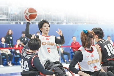 杭州亞殘運會輪椅籃球女子金牌賽,中國體育代表團(tuán)運動員張雪梅(左二)在比賽中。環(huán)球時報記者 崔 萌攝