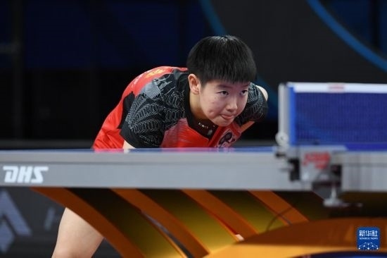 12月22日,深圳大學(xué)隊選手孫穎莎在女團半決賽中等待對方發(fā)球。她以3比0戰(zhàn)勝華東理工大學(xué)隊選手趙尚。最終深圳大學(xué)隊以總比分3比1戰(zhàn)勝華東理工大學(xué)隊。新華社記者 梁旭 攝