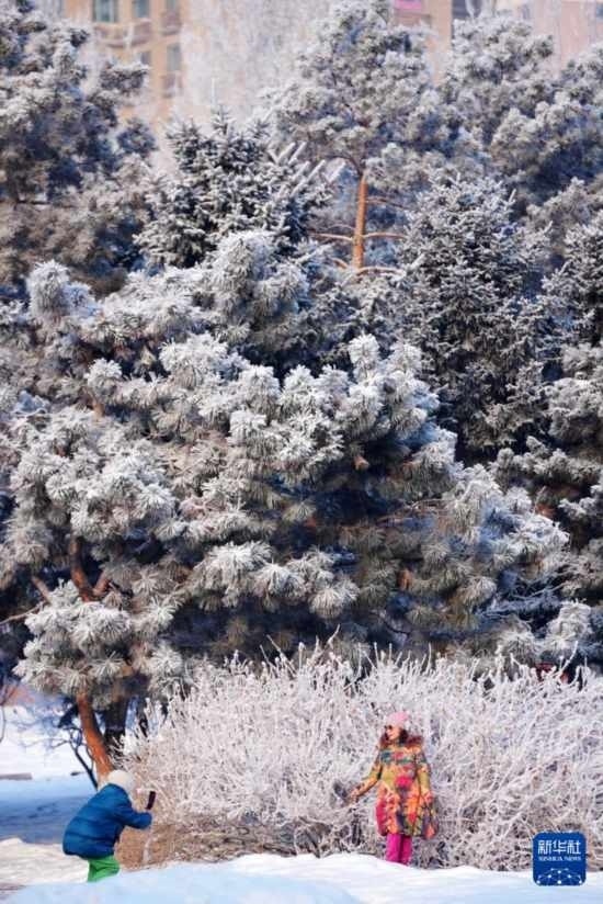 當日,降雪后的冰城哈爾濱市出現霧凇景觀,大地銀裝素裹,玉樹瓊枝美如畫卷。
