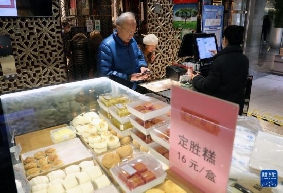 1月9日,在黃河路上的老字號(hào)點(diǎn)心店杏花樓,市民在選購(gòu)劇中的同款點(diǎn)心定勝糕。新華社記者 劉穎 攝