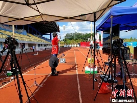 國家體育訓(xùn)練南方基地(海南白沙·綜合),國家射箭隊運動員在技術(shù)分析靶場練習(xí)。中新網(wǎng)記者王曉斌攝