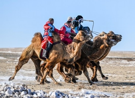 茫茫草原能賽馬,茫茫沙漠就能賽駱駝。2023年底在阿拉善右旗舉行的阿拉善萬峰駝那達慕大會上,設置了駱駝短距離速度賽、長距離耐力賽、接力賽等,還有駝球表演賽。按照當?shù)啬撩竦恼f法,賽駱駝就得在冬天,因為冬天的駱駝最漂亮。