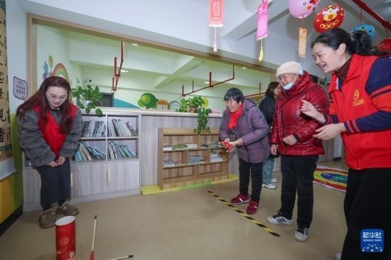 2月22日,在飛英街道吉北社區(qū)活動(dòng)室里,黨員志愿者帶著老人玩投壺游戲。