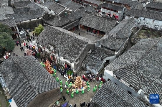 2月23日,舞獅隊在古鎮(zhèn)為觀眾表演(無人機照片)。
