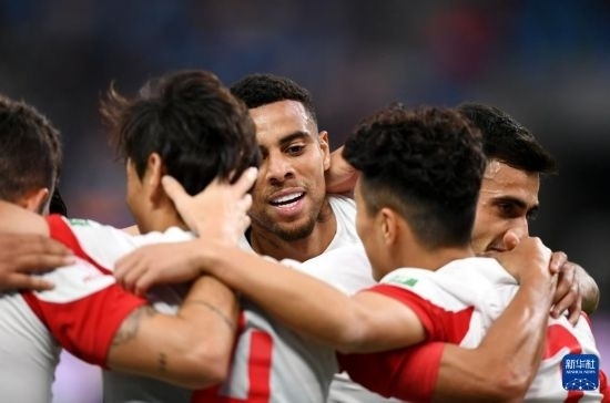5月1日,上海海港隊球員武磊(左二)在比賽中與隊友慶祝進球。