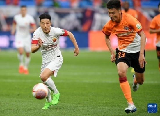 5月1日,上海海港隊球員武磊(左)在比賽中帶球突破。