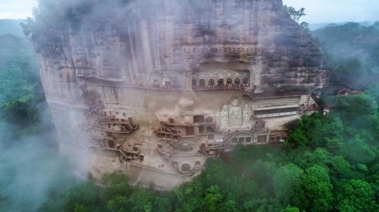 這是2023年5月31日在甘肅省天水市拍攝的煙雨籠罩下的麥積山石窟(無人機照片)。新華社記者 郎兵兵 攝