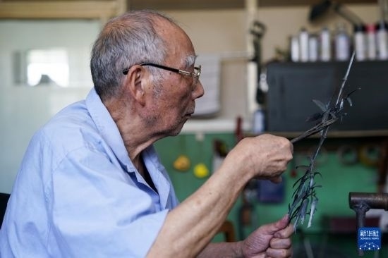 今年80歲的湯傳松,是蕪湖工藝美術(shù)廠的技術(shù)總監(jiān),也是蕪湖鐵畫鍛制技藝省級(jí)非物質(zhì)文化遺產(chǎn)傳承人。據(jù)湯傳松介紹,鐵畫鍛制工藝起源于鐵匠,需將鐵燒紅,而后使用錘頭趁熱打鐵,將鐵塑造成畫稿中的基本形狀,而后使用銼、鉆等工具進(jìn)一步塑造,乃至用剪刀、鑷子進(jìn)行修形,再將各個(gè)部位焊接組合,最后裝裱成畫,流程繁多,制作周期較長。