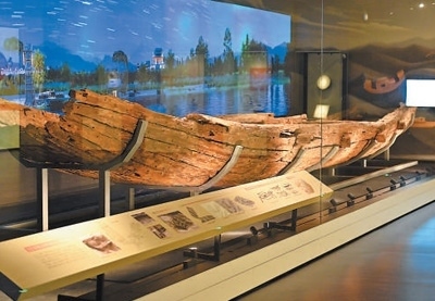圖為陜西歷史博物館秦漢館展出的漢代古船“絲路一號”。新華社記者 李一博攝