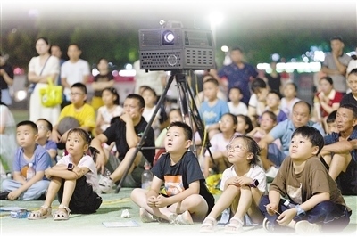 近日,在湖北省襄陽市??悼h體育場(chǎng),孩子們?cè)谟^看電影。楊 韜攝(人民視覺)