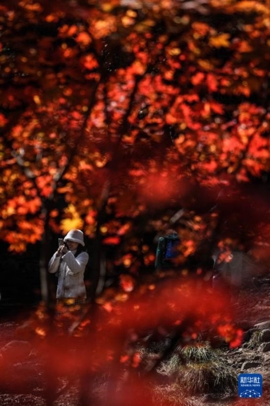 10月7日,遼寧本溪老邊溝風(fēng)景區(qū)內(nèi)的楓樹正值最佳觀賞期,很多游客來到這里觀賞金秋“楓”景。