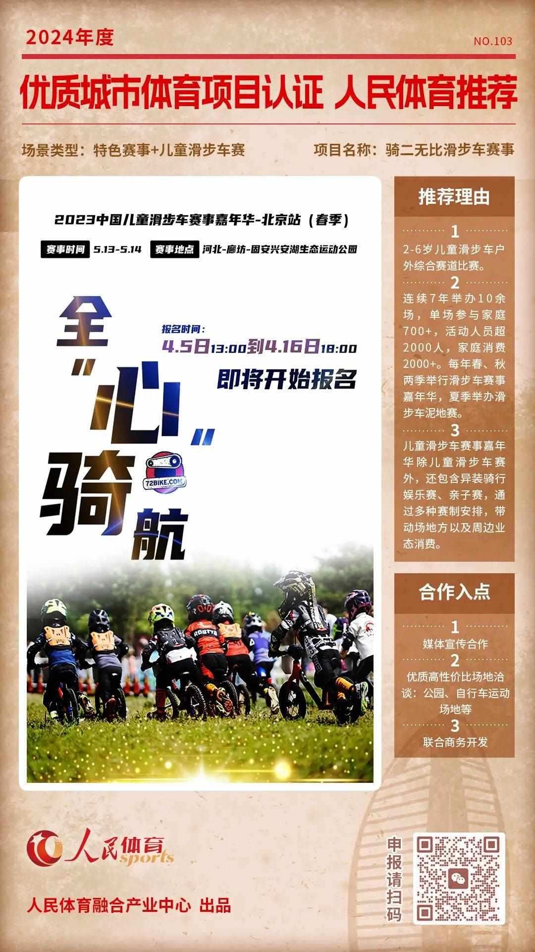“優(yōu)質(zhì)體育賽事及活動認(rèn)證推薦計劃”是人民體育“城市體育產(chǎn)業(yè)高質(zhì)量發(fā)展計劃”的重要組成部分,人民體育一直致力于攜手權(quán)威機構(gòu)、組織單位等聯(lián)合推薦優(yōu)質(zhì)項目,項目類型包括且不限于賽事、活動,也涵蓋產(chǎn)品與服務(wù)類別。旨在以更客觀的角度,展示在體育產(chǎn)業(yè)發(fā)展中有所創(chuàng)新,有所價值的項目,促進多方相互了解,融合發(fā)展。