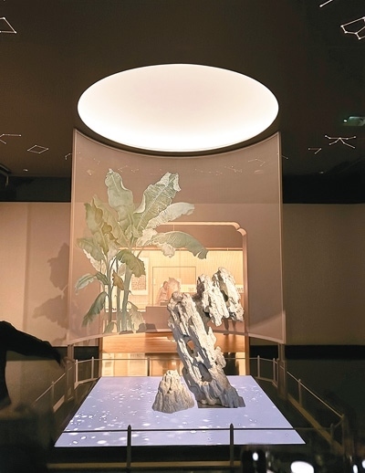 步入上海博物館東館最新開放的“中國歷代書法”展廳,觀眾會立刻沉浸于一種雅致、古典的氛圍。序廳正中立著一尊太湖石雕塑,上方的燈光宛如一輪圓月,石后的幕布上繪著一樹芭蕉,石下的LED屏幕顯出一汪碧色湖水,伴著間或響起的水滴聲,蕩起漣漪。