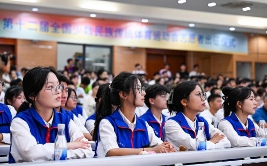 11月4日,第十二屆全國少數(shù)民族傳統(tǒng)體育運動會志愿者在出征儀式上。新華社記者 楊冠宇 攝