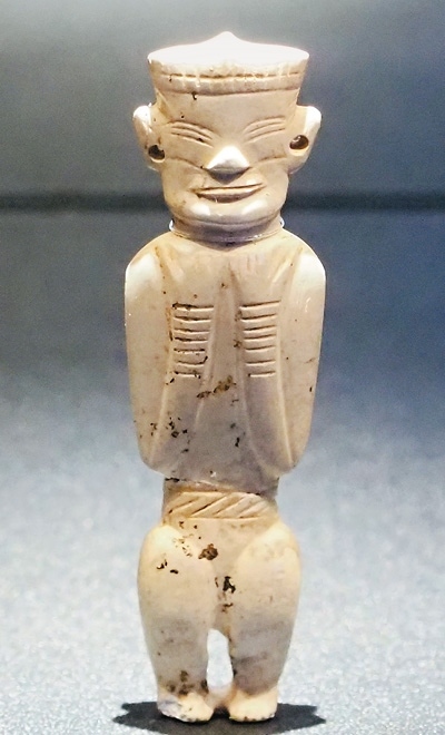 凌家灘遺址出土的玉人頭雕像,頭戴三瓣葉式冠,額上有3道凸棱,額中部向上略隆起,其下似鼻梁,兩眼殘存一半,呈橢圓形上挑,與良渚玉器中的神人像頗為相似。