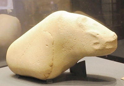 此次展覽以多媒體形式介紹了這座“王者之墓”的形制和隨葬品,并展示了墓中出土的重要文物。玉石豬是目前國內(nèi)考古發(fā)現(xiàn)的同時代最大、最重的玉雕作品。豬拱部凸出,其上有兩個鼻孔,嘴兩側(cè)刻上彎的獠牙,應為野豬形態(tài)。眼和豎耳用減地法表現(xiàn),頸部寬而淺,腹部一側(cè)刻兩條彎曲的線,象征蜷曲的雙腿。這件大玉豬發(fā)現(xiàn)于墓口上方而不是墓底,可能有某種指示或鎮(zhèn)墓功能。