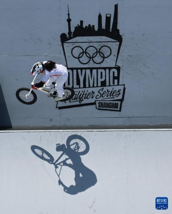 這是2024年5月18日,中國選手鄧雅文在巴黎奧運會資格系列賽上海站小輪車自由式女子公園賽決賽中。新華社記者 王楷焱 攝