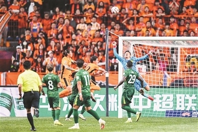 北京國安隊門將韓佳奇(上右)在比賽中撲救。