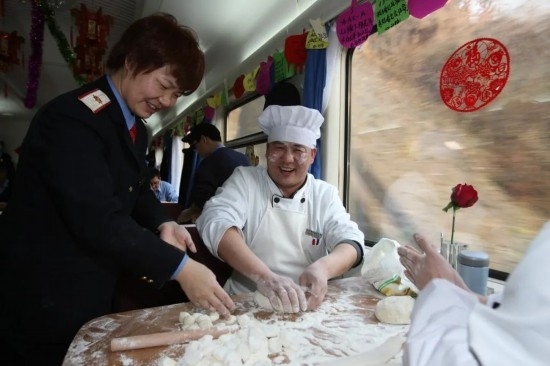 2013年除夕,北京西開(kāi)往成都的列車上,鐵路職工包餃子迎新春。