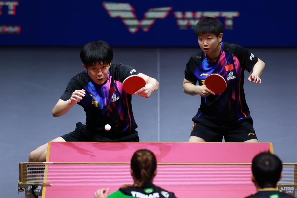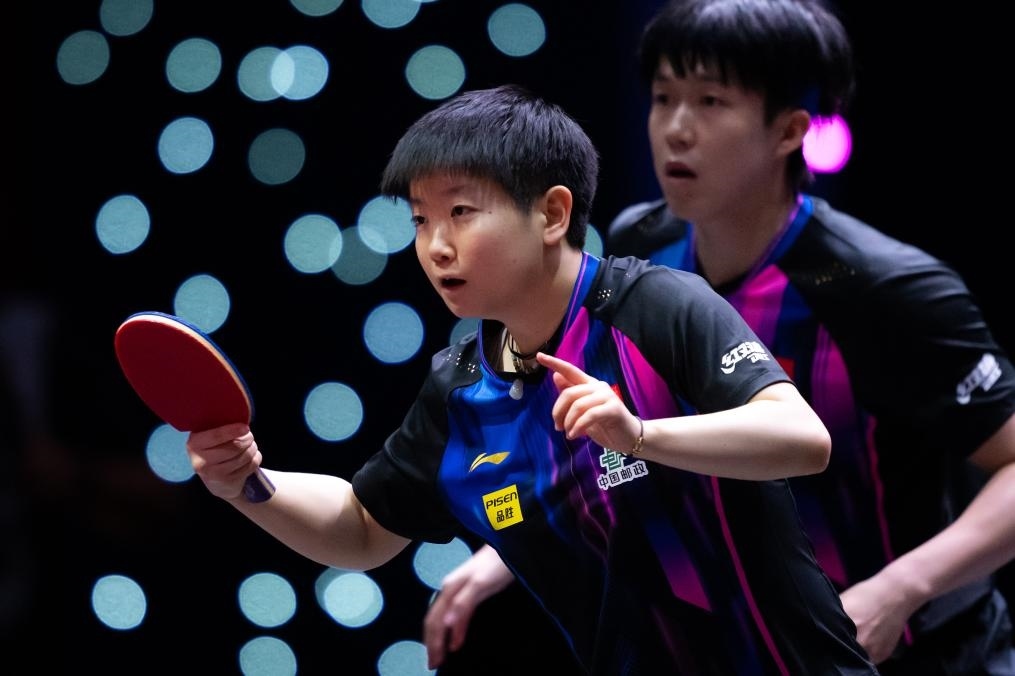 5月19日,王楚欽/孫穎莎(左)在比賽中。新華社記者 肖藝九 攝