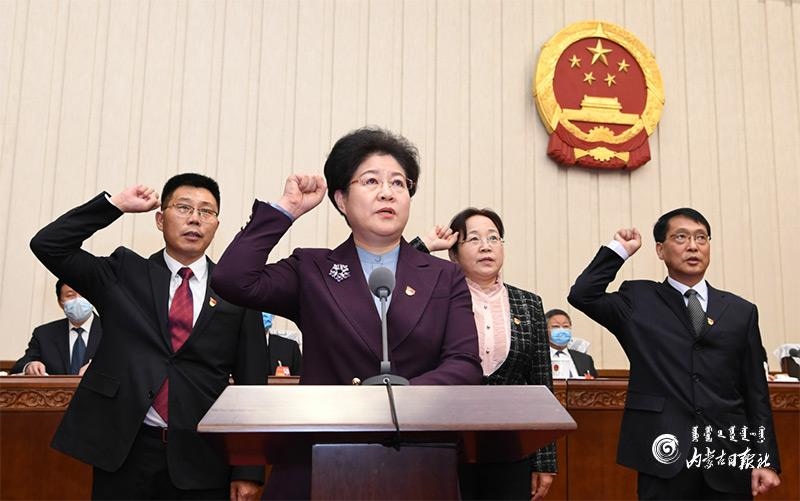 1月20日上午,自治區(qū)十三屆人大常委會第二十四次會議舉行了憲法宣誓儀式。自治區(qū)黨委書記、人大常委會主任石泰峰主持并監(jiān)誓。圖為新任職人員在依法進行憲法宣誓。內(nèi)蒙古日報記者 袁永紅 攝