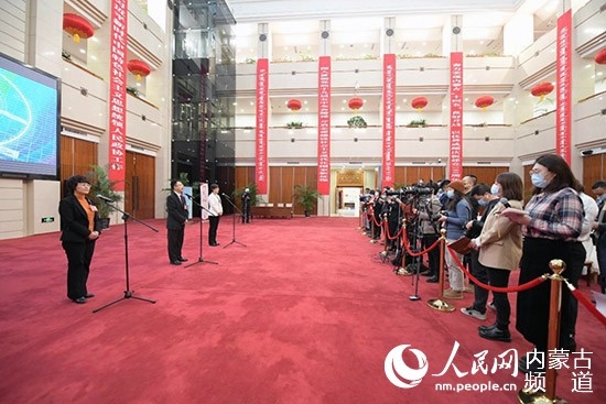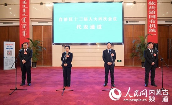 內(nèi)蒙古開啟首次代表通道,陳功明代表(左一)就生態(tài)建設問題答記者問。 陳立庚 攝
