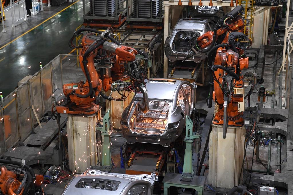 工業(yè)機(jī)器人在江淮汽車(chē)乘用車(chē)焊接車(chē)間生產(chǎn)線(xiàn)上工作(2月22日攝)。新華社記者 劉軍喜 攝