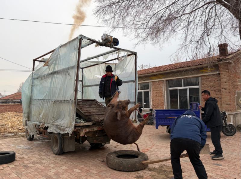吃殺豬菜一向講求男女分工,家中的男子負(fù)責(zé)抓豬屠宰,女性們則負(fù)責(zé)后續(xù)的備菜烹煮工作。男人們穿上厚實(shí)的棉襖,呵著白氣走向豬圈,用早已準(zhǔn)備好的繩索,麻利地將豬的四肢捆扎結(jié)實(shí)。隨后,幾人合力將豬抬到宰豬的車上,王國春深吸一口氣,拿起殺豬刀,對(duì)準(zhǔn)豬的脖頸,動(dòng)作干脆利落。鮮紅的豬血順著事先準(zhǔn)備好的大盆緩緩流淌,不一會(huì)兒就接了滿滿一盆。殺完豬,男人們顧不上休息,就趕忙用滾燙的開水給豬褪毛,鐵刮子在豬身上來回刮擦,發(fā)出“唰唰”的聲響,不一會(huì)兒,原本黑乎乎的豬就變得白白凈凈。緊接著,他們立刻將豬開膛破肚,把內(nèi)臟分門別類地整理好,豬頭、豬蹄也被仔細(xì)地清洗干凈,準(zhǔn)備著后續(xù)的處理。