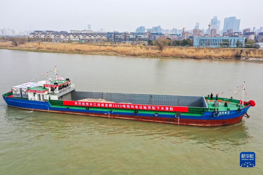 “船聯(lián)1號(hào)”電動(dòng)貨船在長(zhǎng)江南京段航行(2月22日攝,無(wú)人機(jī)照片)。